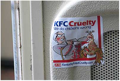 Heh. PETA makes me laugh. Now, don’t get me wrong. I think animal rights is a good thing. But PETA’s message tends to be so extreme that it becomes ridiculous. This sticker on the local KFC drive through box just made me enjoy my chicken dinner a little bit more.