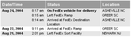 The package containing my new compact flash card is currently on a truck very near me. It’s a miracle package as well! Notice how it left Greer, SC at 8:15 a.m. and arrived many miles away in Asheville, NC at 8:14 a.m. There is sat for whole three minutes before departing FedEx at 8:17 a.m. Sweet. FedEx has apparently mastered use of the Space Time Continuum.