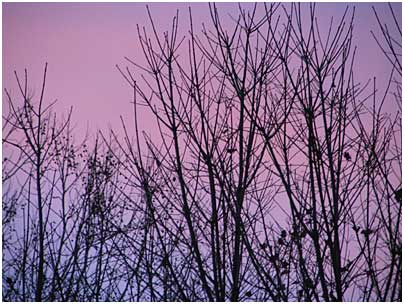 Yesterday’s sunset through the trees. All the leaves are now gone and I have started to settle into my winter hibernation routine.