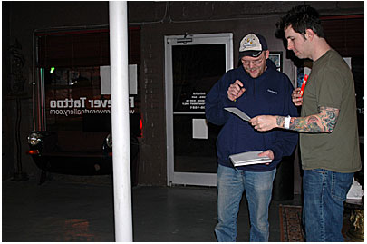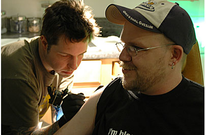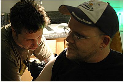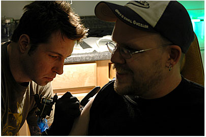 He he! Yay! The look on your face is perfect… captured so well by your pal Christy, while you are getting that tat. It puts a huge smile on my face. Nothing like a man with arms full of ink, givin’ it to ya, huh? *grin*