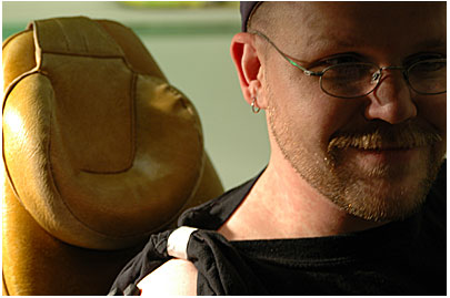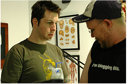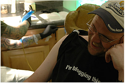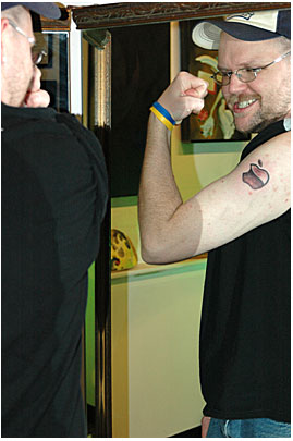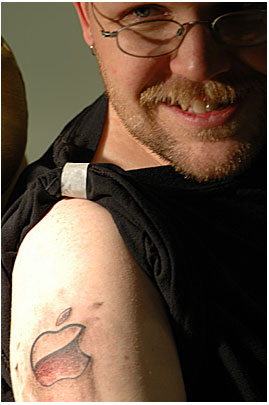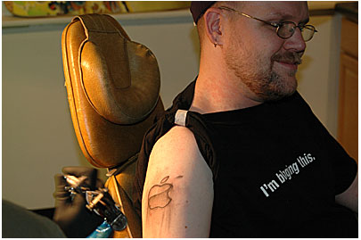 All-all-all it wasn’t so bad. Rob (the tat man) was really cool and laid back. Franke was there to watch the process (she gets hers on Saturday) and keep me calm. Christy was there to record the event. The whole thing only took about a half an hour once I was in the chair. And now everyone thinks I am a total nerd for doing the Apple logo. I don’t care ’cause I like it! I think I might have to go back for another tat at some point. Heh, heh. They say once you get the first one you’ll want another.