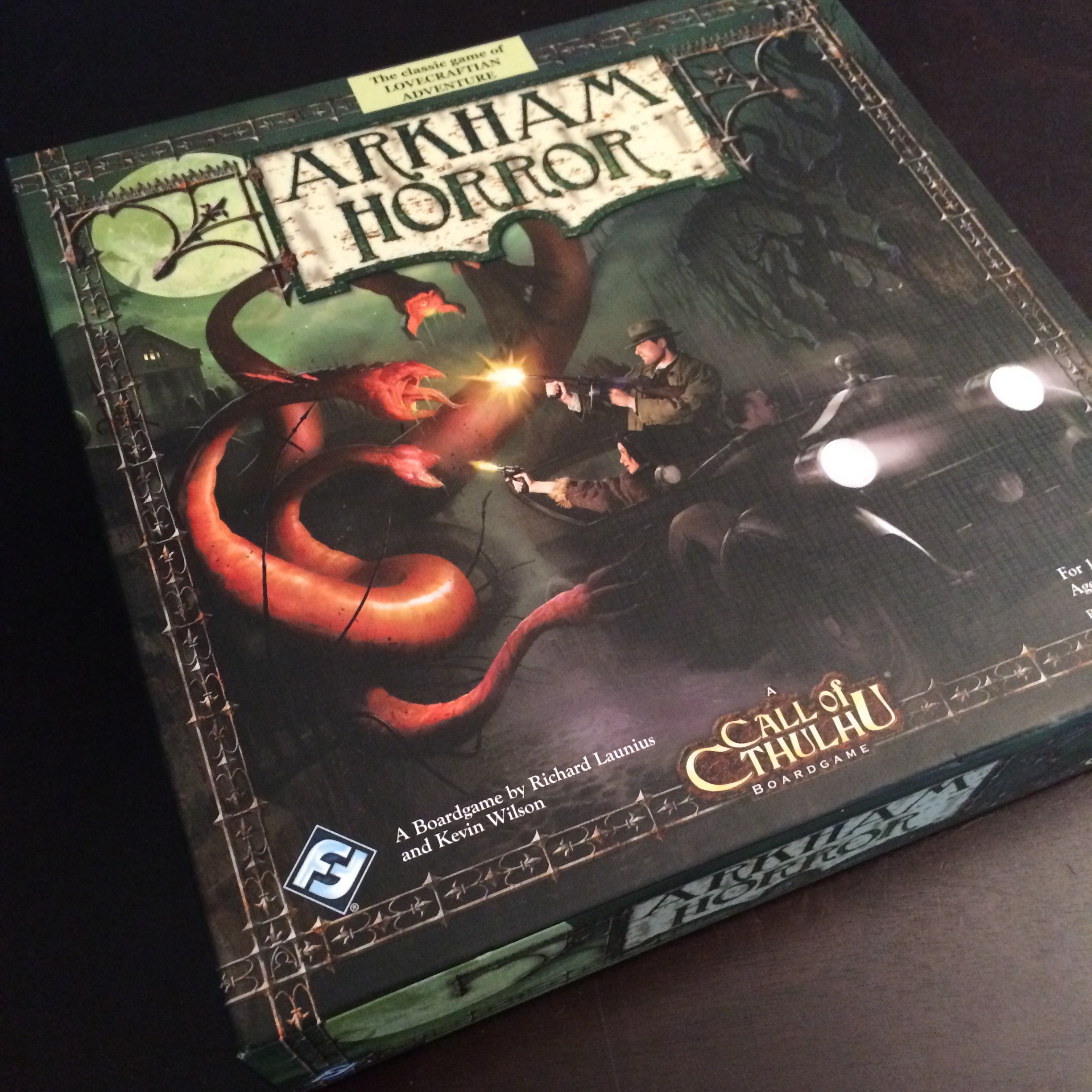 I was just tipsy enough after our moonshine tasting at Doc Collier’s that I pulled the trigger on Arkham Horror. It’s a massive (and expensive) cooperative game based on the writings of H.P. Lovecraft.